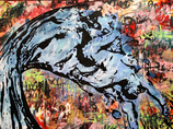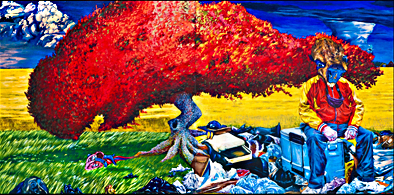 Saxby uses vibrant colors that contrast dark and allegorical themes